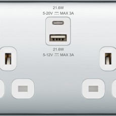 This 13A double socket from British General comes with integrated fast charge USB-A and USB-C ports, allowing you to plug in an electrical device and charge mobile devices simultaneously without having to sacrifice a power socket. The 22 Watt variable voltage fast charging supports PD & QC charg..